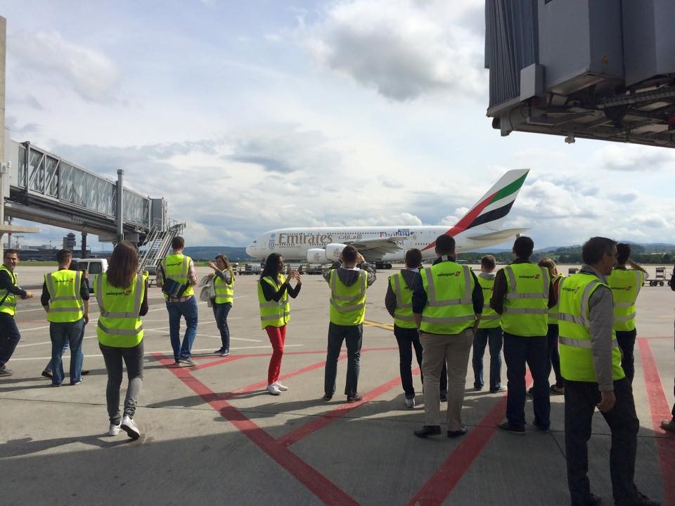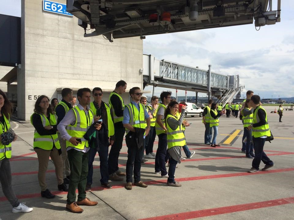 On a beautiful Saturday afternoon 20 alumni gathered at Zürich Airport to enjoy a tour behind the scenes and some quality time together. After learning about some general facts and figures about the airport, we passed security control and went onto the tarmac where our guide, who was working for 30 years for Swissair and then Swissport in Zürich and New York, told us a bit more about the outline of the airport and how it has grown from a small airport, where passengers used to walk from the gate to the aircraft on foot to today’s international airport that handles 250’000 flights per year and through which 25 million passengers travel each year.