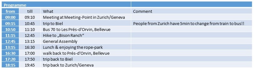 Travel costs and entry to rope park (CHF 31.-) are to be covered individually, lunch is planned to be subsidized by AAS, depending on the amount of participants.